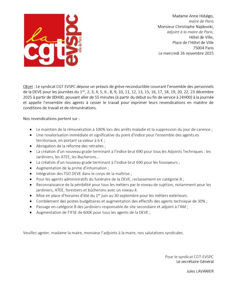 Ce préavis couvre l’ensemble des personnels de la DEVE, et leur permettra notamment de revendiquer: