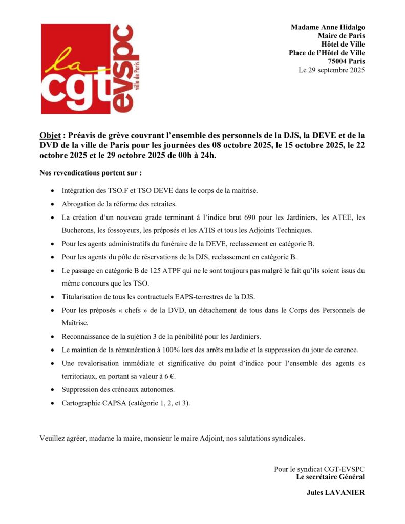 Le Syndicat CGT-EVSPC a déposé un préavis de grève couvrant les mercredis du mois d’octobre afin de permettre aux agents des division de la DJS, de la DEVE et de la DVD de se mobiliser.