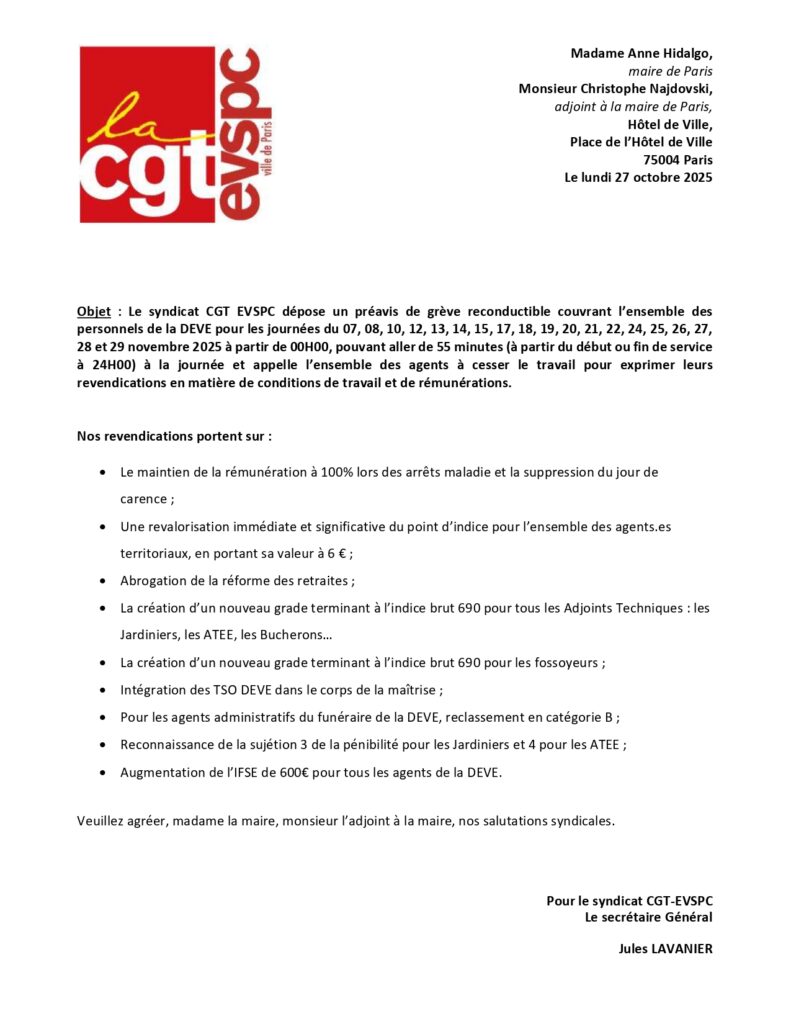 Le syndicat EVSPC a émis un préavis de grève reconductible pour la DEVE pour le mois de novembre 2025.